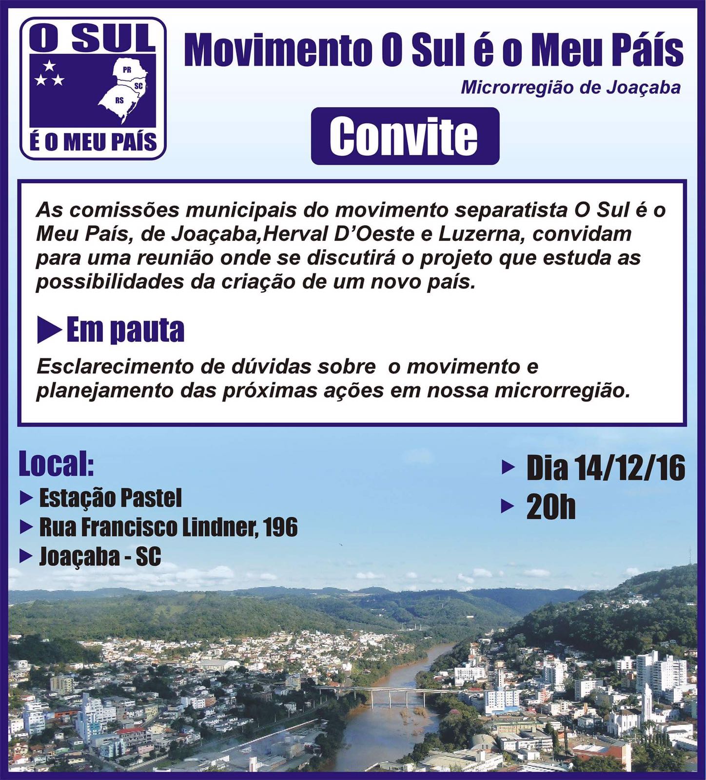 As comissões municipais do movimento separatista O Sul é o Meu País de Joaçaba, Herval D'oeste e Luzena convidam para uma reunião onde se discutirá o projeto que estuda as possibilidades de criação…