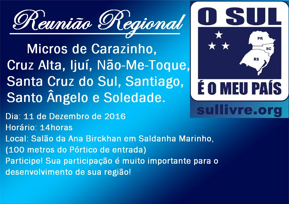 Convidamos as Microrregiões abaixo a para Reunião Regional que ocorrerá no dia 11/12 (domingo), às 14h00, em Saldanha Marinho/RSMicroregião de Carazinho; Microregião de Ijuí; Microregião de Cruz…