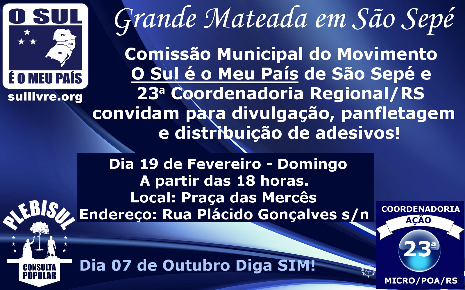 Neste domingo, 19/02, a partir das 18h00 a comissão municipal do movimento O Sul é o Meu País de São Sepé/RS, com o apoio da 23ª Coordenadoria Regional de POA convidam para Grande Mateada. A…