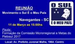 No próximo sábado, dia 11 de março, a partir das 15h00 o Movimento o Sul é o Meu País fará uma reunião em Navegantes/SC. O encontro terá a presença dos Coordenadores Marcos Pereira, Fernanda Stolf e…