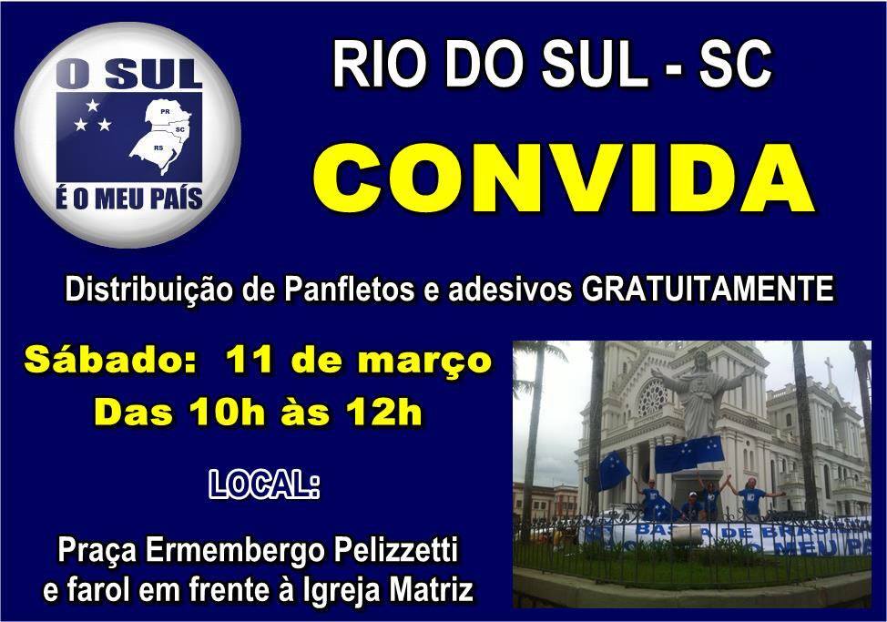 A comissão municipal do movimento o Sul é o Meu País de Rio do Sul/SC realizará neste sábado um ADESIVAÇO, com distribuição de panfletos e adesivos GRATUITAMENTE. Ele acontecerá neste dia 11 de…