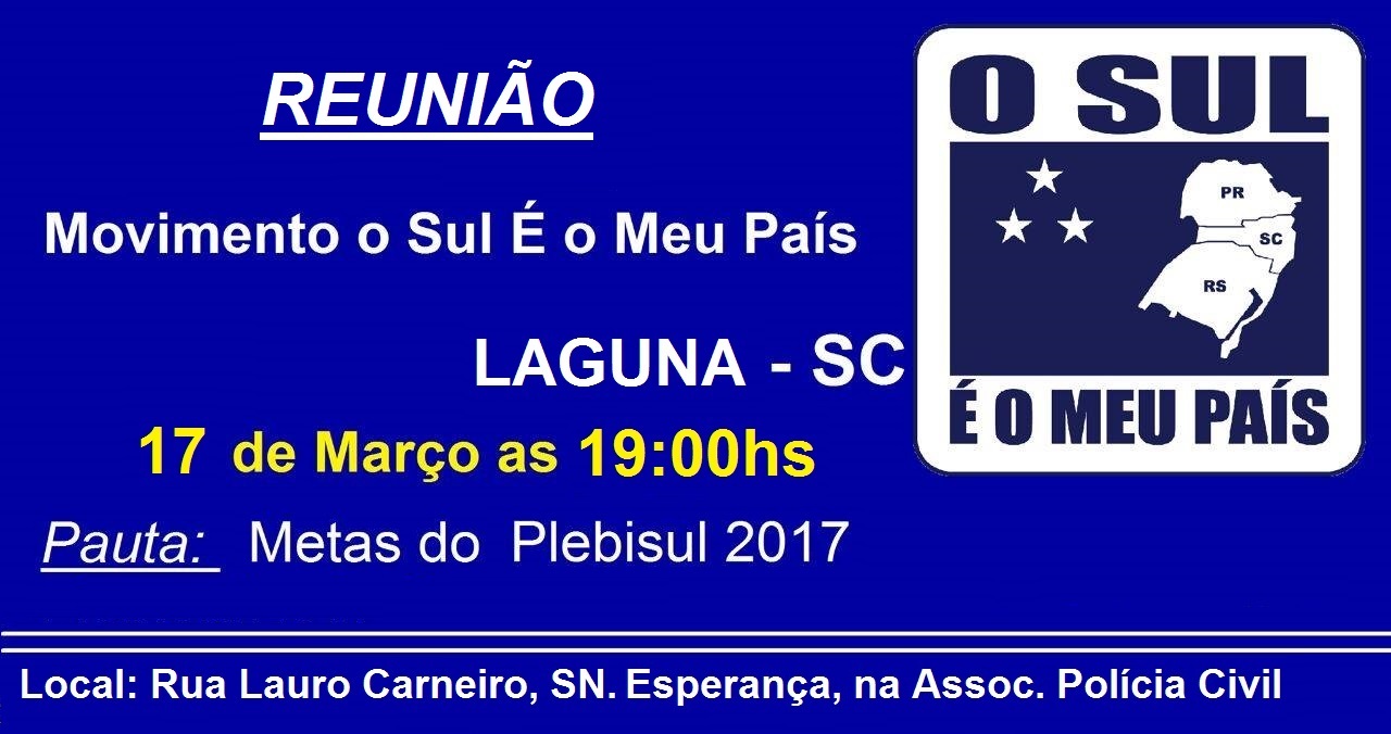 O movimento O Sul é o Meu País realizará reunião em Laguna/SC no dia 17 de março, a partir das 19h00 na Associação da Polícia Civil, localizada na Rua Lauro Carneiro, sn, Bairro Esperança. O evento…