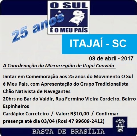 O Movimento o Sul é o Meu País convida para um jantar em comemoração aos seus 25 anos de fundação. Ele acontecerá no dia 08 de abril de 2017, a partir das 20h, no Bar do Valdir, localizado na Rua…