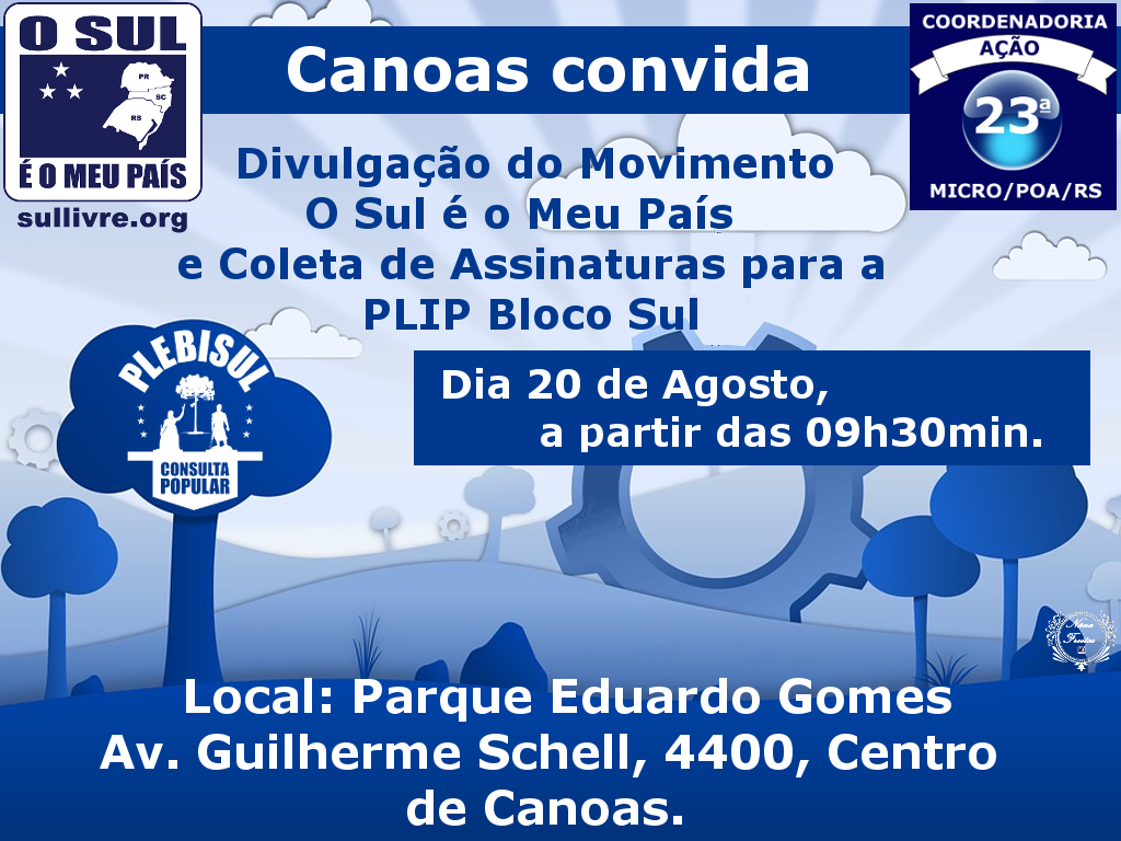 No dia 20 de agosto, domingo, a Comissão Municipal de Canoas/RS irá fazer divulgação do Movimento O Sul é o Meu País no Parque Eduardo Gomes. Ela acontecerá a partir das 9h30, na Av Guilherme Schell,…