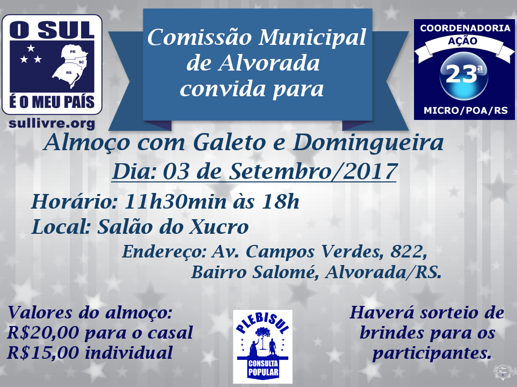 No dia 03 de setembro a Comissão Municipal do Movimento O Sul é o Meu País de Alvorada/RS irá promover um almoço com galeto e na sequência uma domingueira. O evento custará R$20,00 para o casal ou…
