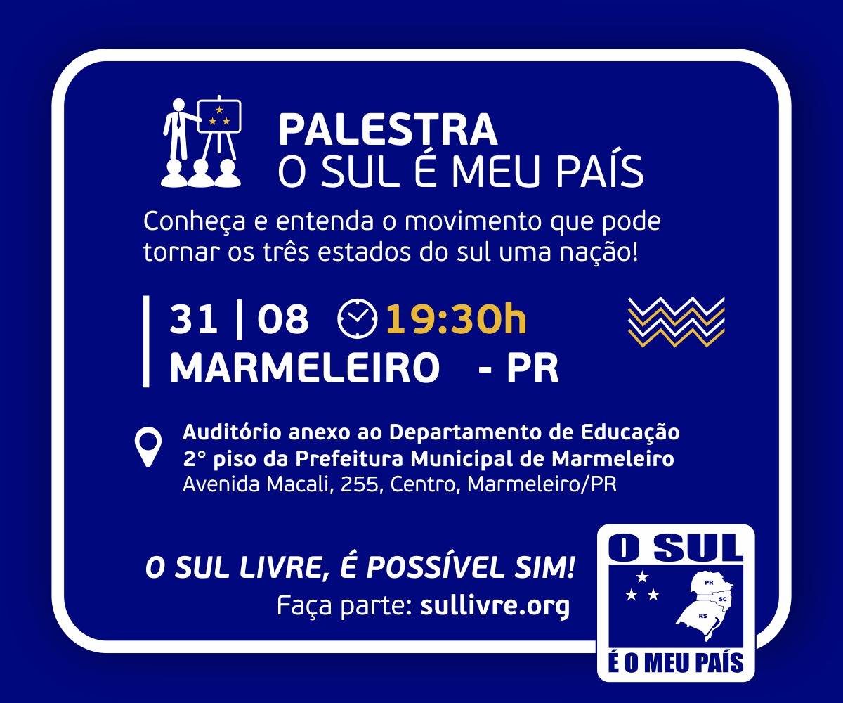 No próximo dia 31 de agosto, quinta-feira, será realizada palestra do Movimento O Sul é o Meu País em Marmeleiro/PR. O evento acontecerá a partir das 19h30 no auditório do Centro de Capacitação de…