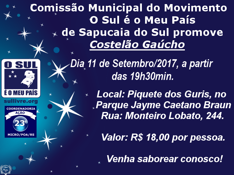 A Comissão Municipal de Sapucaia do Sul, promoverá nesta segunda-feira, dia 11 de setembro, um costelão gaúcho, com valor individual de R$18,00. A janta é uma comemoração à criação da Chama de…