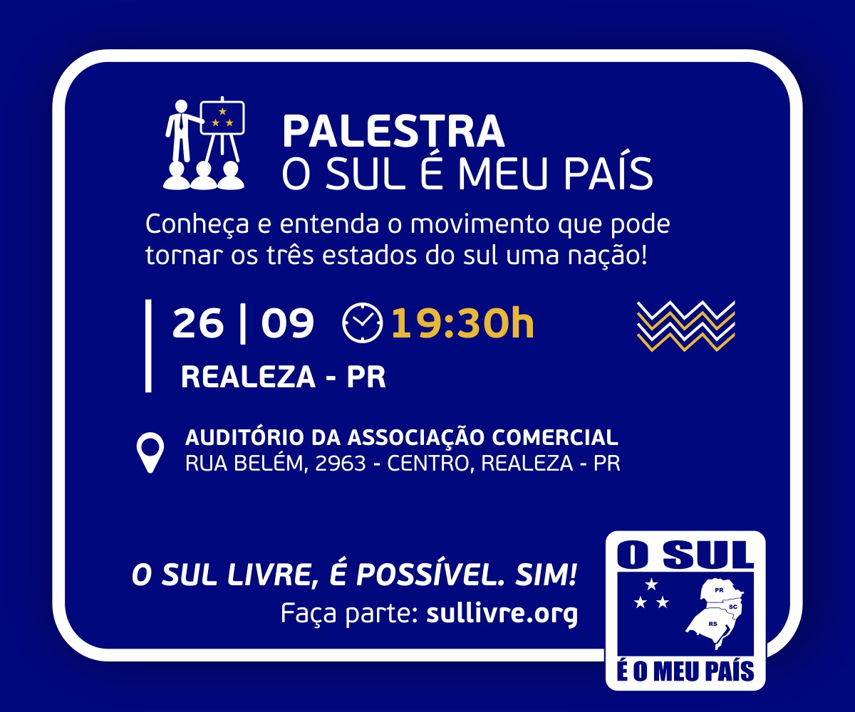 O Movimento O Sul é o Meu País a convida todos para palestra que será realizada no dia 26 de setembro (terça-feira), no auditório da Associação Comercial, com início às 19:30 horas. Venha fazer parte…