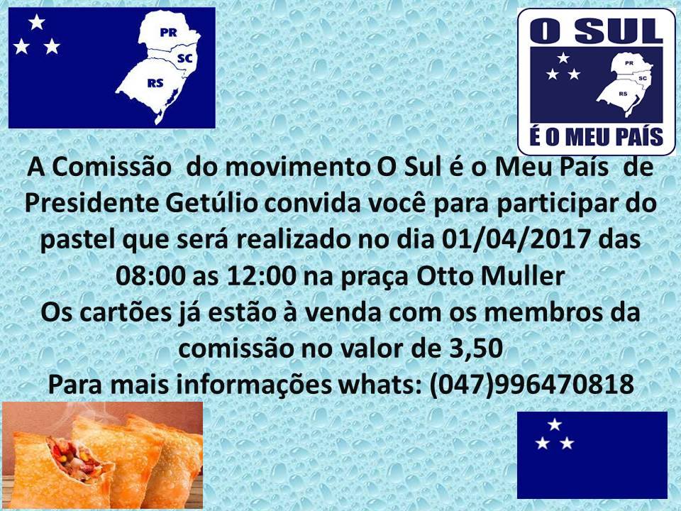 A Comissão Municipal do Movimento o Sul é O Meu País de Presidente Getúlio / SC, convida todos os sulistas de Pres. Getúlio e região, para a 2ª Pastelada Sulista.
