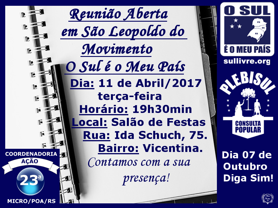 Prezado compatriota de São Leopoldo e região, venha nos prestigiar com a sua presença, no dia 11 de Abril, próxima terça-feira, na reunião que ocorrerá para esclarecimento de dúvidas, cadastramento de voluntários para o Plebisul 2017 e demais assuntos.