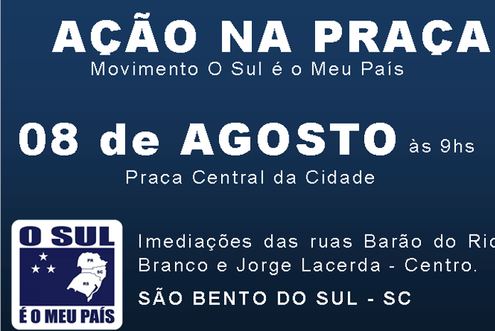 A Comissão de São Bento do Sul no norte catarinense, promove nesse próximo sábado dia 08 de Agosto uma ação de divulgação do Movimento O Sul é o Meu País, na Praça Central da cidade à partir das 9hs. A praça que fica na imediações das ruas Barão do Rio Branco e Jorge Lacerda, no centro de São Bento do Sul. O evento terá fim próximo ao meio – dia.