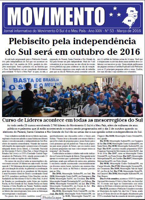 Desde 1992, quando foi criado, o Jornal do Movimento é o veículo oficial de divulgação do Movimento O Sul é o Meu País. Neste mês de maio, na sua 53ª Edição, o periódico trás importantes informações que você e a sua comunidade precisam saber sobre os Cursos de Líderes, os Princípios da organização e principalmente, uma matéria especial com tudo sobre a realização do Plebiscito 2016, que acontecerá no dia 2 de outubro. Trata-se de umas das melhores formas de divulgação da causa Sulista em sua cidade. Adquira um milheiro do Jornal pelo preço de custo, R$ 150,00 para distribuição na sua comunidade. Entre em contato com a compatriota Sandra Parma pelo fone/whatsApp (47) 9987-2640 ou ainda pelo e-mail sanparma@gmail.com. Você contribui com a causa e divulga nossos ideais aos seus conterrâneos.