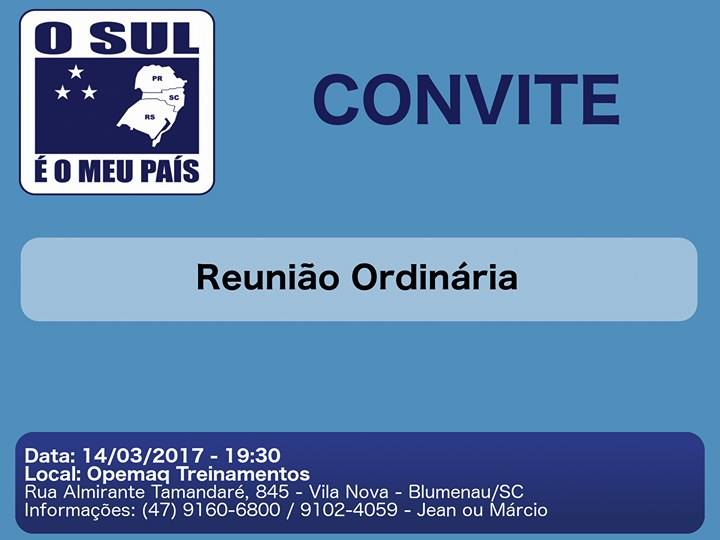 A comissão municipal do movimento O Sul é o Meu País de Blumenau /SC convida toda a comunidade para uma reunião que será realizada no dia 14 de março (terça-feira), às 19h30.