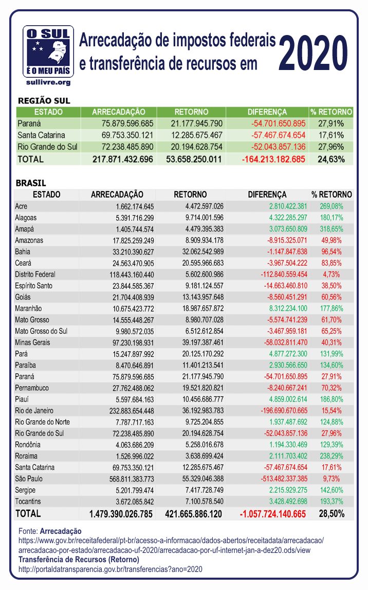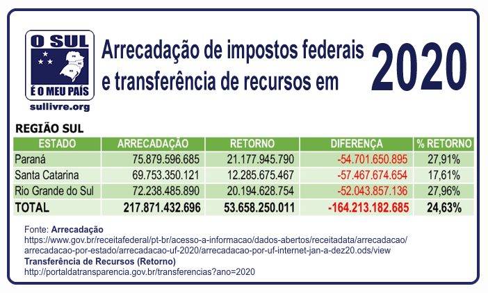 Os números, pesquisados por Fabricio Barbosa, no próprio Portal da Transparência do governo federal, mostram que a união abocanhou 75,37% dos tributos dos estados e municípios do Sul, devolvendo vergonhosos 24,63%. Em bilhões de reais, o Sul arrecadou no ano de 2020 exatos R$ 217.871.432.696 e recebeu de volta R$ 53.658.250.011. O governo federal se apossou indevidamente de R$ 164.213.182.685 da arrecadação Sulista.