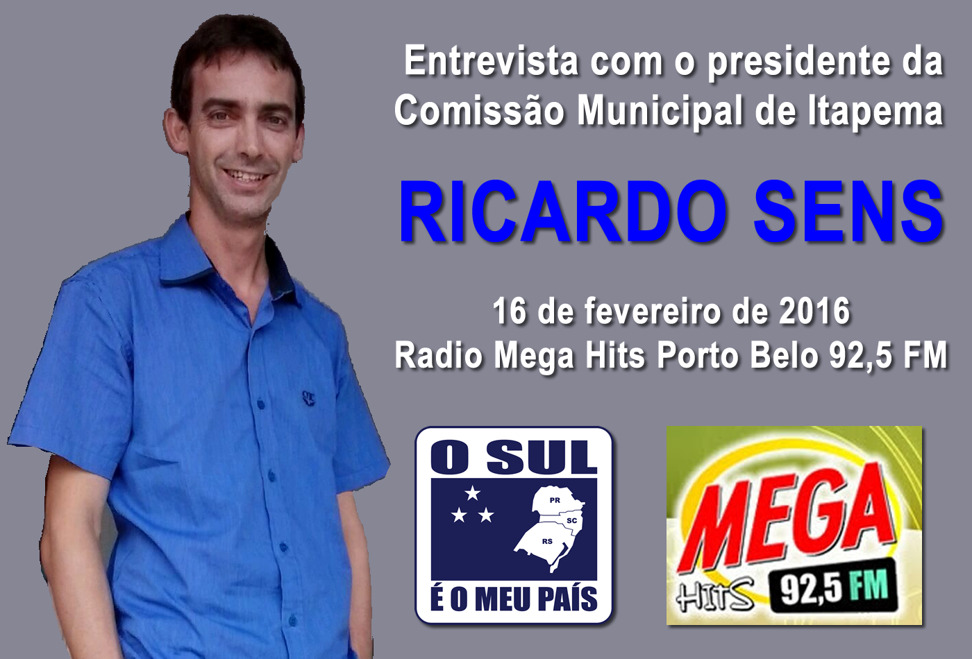 Nesta terça-feira (16/02) o presidente da Comissão Municipal de Itapema/SC deu entrevista sobre o movimento O SUL É O MEU PAÍS na Rádio Mega Hits Porto Belo 92,5 FM. Confira a entrevista no…