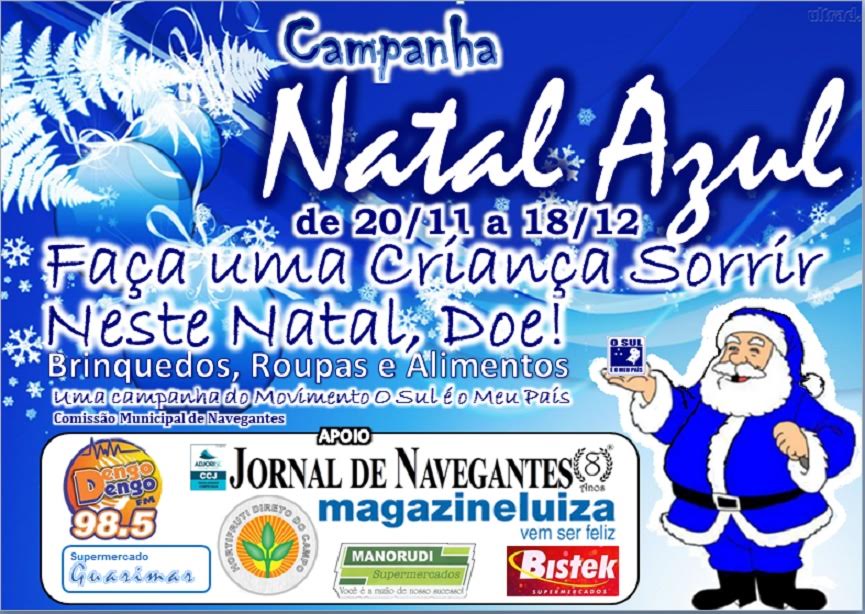 A Comissão Municipal de Navegantes/SC promove de 20/11 a 18/12 a primeira edição do Natal Azul. A ação visa arrecadar roupas, brinquedos e alimentos para serem doados à instituições de auxílio do município. Os postos de coleta são em Supermercados da cidade. Para a realização do evento a Comissão local conta com o apoio das mídias locais (Rádio Dengo Dengo FM e Jornal de Navegantes), bem como com o comércio de Navegantes.