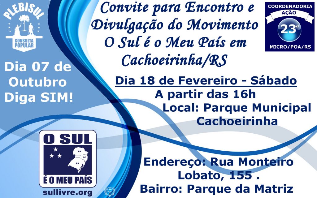 No próximo sábado, dia 18 de fevereiro, a coordenação da microrregião de Porto Alegre/RS realizará divulgação em Cachoeirinha/RS. O evento acontecerá a partir das 16h00 no Parque Municipal Cachoeirinha, localizado na R. Monteiro Lobato, 155.