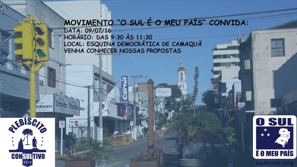 Próximo sábado, dia 09/07/16, a comissão municipal de Camaquã/RS fará uma divulgação do movimento O SUL É O MEU PAÍS na Esquina Democrática de Camaquã (esquina ruas Presidente Vargas e Olavo Moraes),