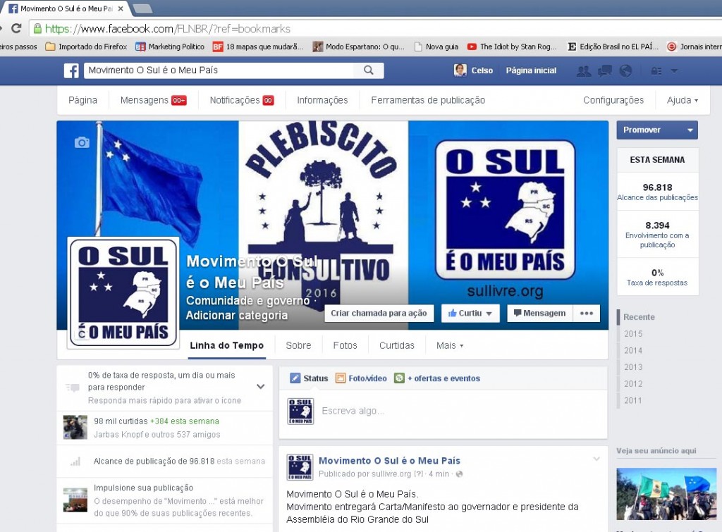 O Fanpage oficial do Movimento O Sul é o Meu País (https://www.facebook.com/FLNBR/) está muito próxima de atingir a meta que vence neste mês de novembro, de 100 mil curtidas. Hoje ela está com 98.967 curtidas e é um dos principais meios de comunicação da entidade que vem postando diariamente as novidades da Causa Sulista, em especial dos eventos que ocorrem em todos os recantos da nossa Pátria. Se você ainda não curtiu a Fanpage Oficial, este é o momento. Mas faça melhor que isso, COMPARTILHE ela com seus amigos, colegas de escola, de faculdade, de trabalho, familiares e ajude a divulgar a proposta de independência do Sul.