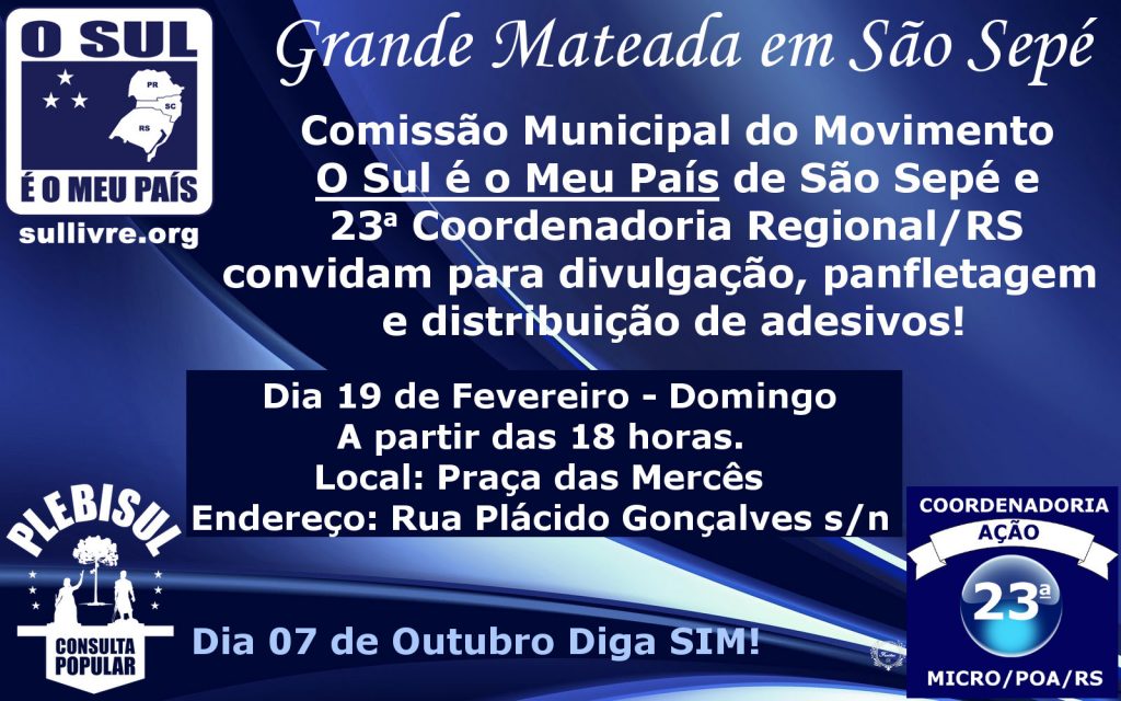 Neste domingo, 19/02, a partir das 18h00 a comissão municipal do movimento O Sul é o Meu País de São Sepé/RS, com o apoio da 23ª Coordenadoria Regional de POA convidam para Grande Mateada.