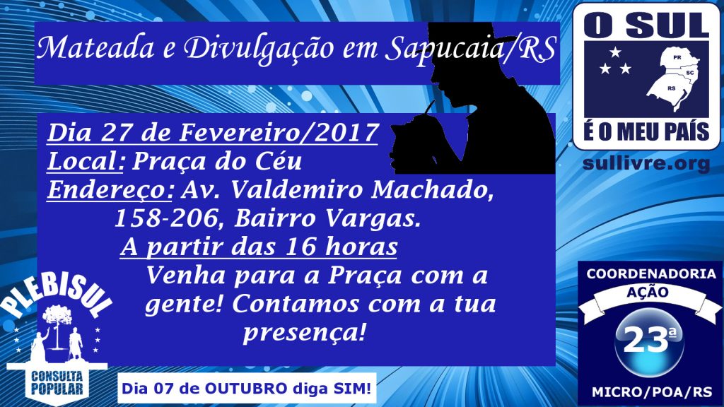 Hoje a partir das 16h a comissão municipal de Sapucaia do Sul/RS fará mateada e divulgação do movimento na Praça do Céu.