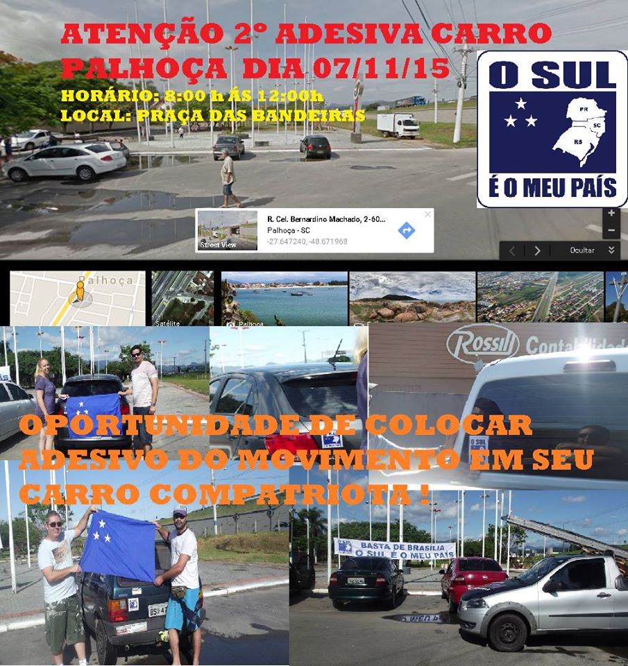 Acontece neste sábado, dia 7 de novembro, em Palhoça/SC, o IIº Adesiva Carro, sob a coordenação da Comissão Municipal da cidade. O compatriota presidente, Vitor Charles Capistrano está convidando a todos os compatriotas da região para participar. O local será na Praça das Bandeiras, das 8 as 12 horas. Compareça, ajude a divulgar a causa e adesive seu veículo. Contatos pelo fone/WhatSapp: (48) 8428-9574.