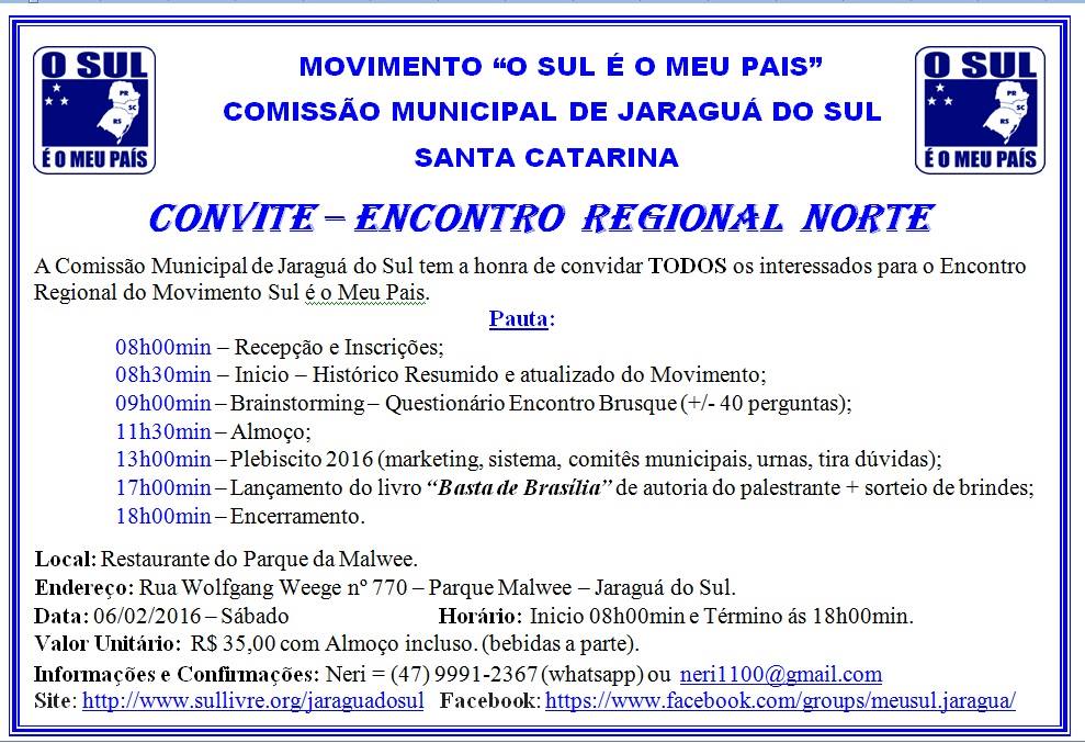 A comissão municipal de Jaraguá do Sul tem a honra de convidar todos os interessados para o Encontro Regional do Movimento O SUL É O MEU PAÍS.