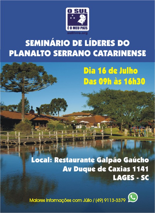 Acontecerá no dia 16 de julho em Lages-SC, o primeiro Seminário de Líderes do Planalto Serrano Catarinense. O evento acontece no Restaurante Galpão Gaúcho das 09h às 16h30min.