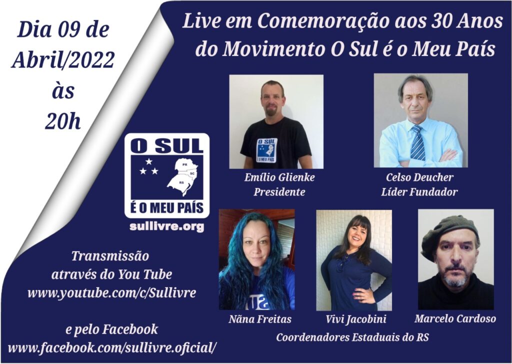Neste sábado, dia 9 de abril, o Movimento O Sul é o Meu País comemora exatos 30 anos de fundação. Para comemorar esta data, por iniciativa e organização da Comissão Estadual do Movimento no Rio Grande do Sul, a comissão nacional promove no canal oficial da entidade no Youtube (www.youtube.com/c/Sullivre) e na fanpage oficial no facebook (www.facebook.com/sullivre.oficial) uma Live com os coordenadores no Rio Grande, Nãna Freitas, Vivi Jacobini, Marcelo Fabiano Lara Cardoso e ainda o presidente nacional do Movimento Emilio Glienke e um dos fundadores do Movimento, Celso Deucher.
