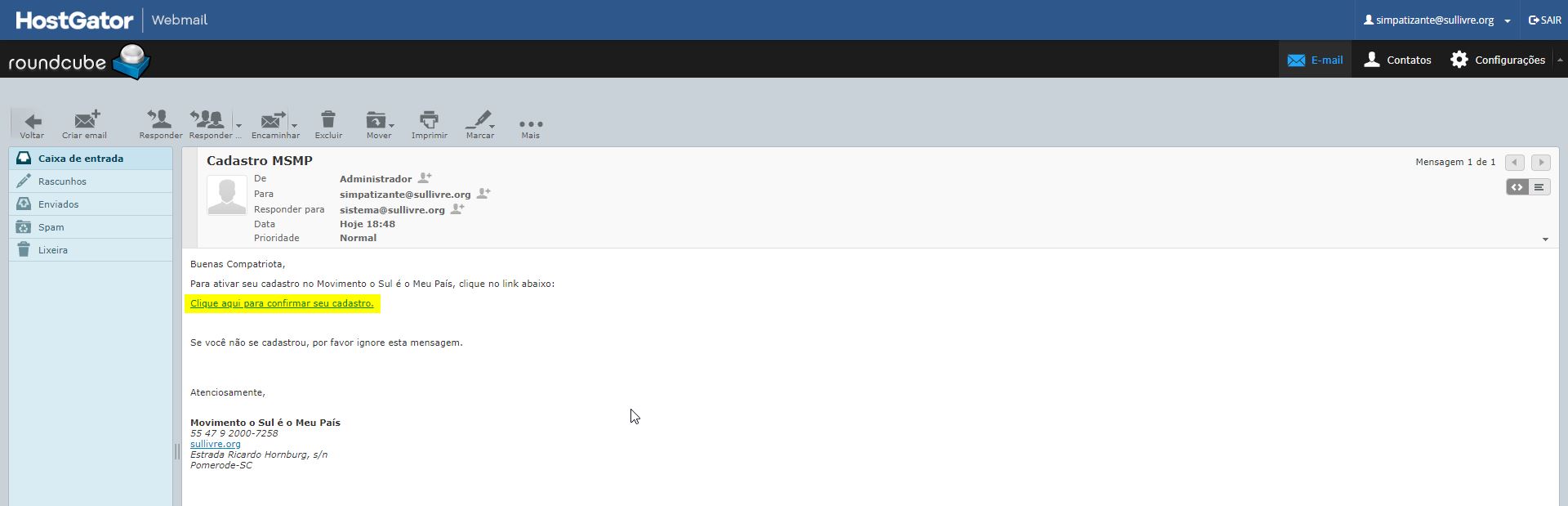 Agora acesse o seu e-mail e clique no link Clique aqui para confirmar seu cadastro.