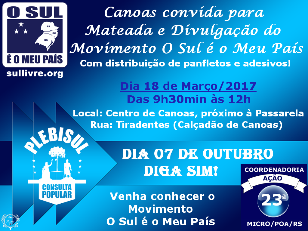 Neste dia 18 de março (sábado) será realizada mateada, divulgação e distribuição de adesivos do movimento O Sul é o Meu País em Canoas/RS.