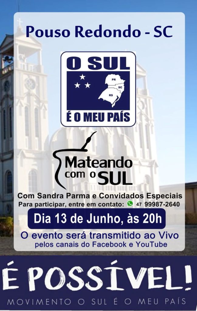Nesta quarta-feira, dia 13 de junho, a partir das 20h00, o Movimento O Sul é o Meu País está iniciando um novo projeto, é o Mateando com o Sul. O primeiro acontecerá em Pouso Redondo/SC e também será transmitido pelo nosso canal no Youtube. Nele serão realizadas reuniões em diversas cidades para falar sobre os impostos que a cidade e o estado arrecada, o quanto vai para Brasília, o quanto fica na região, o que poderia ser feito com estes recursos, além de vários outros tópicos.