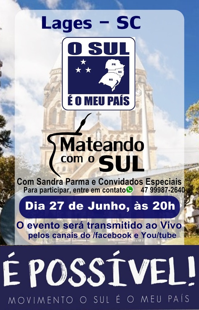 Nesta quarta-feira, dia 27/06, a partir das 20h será realizado o MATEANDO COM O SUL em Lages/SC. Ele será transmitido pelo canal oficial do Movimento no Youtube, no endereço https://www.youtube.com/sullivre. No programa será debatido sobre os impostos que a cidade e o estado arrecada, o quanto vai para Brasília, o quanto fica na região, o que poderia ser feito com estes recursos, além de vários outros tópicos.