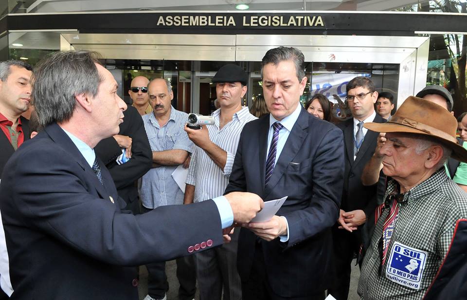 “Um dia histórico para o Movimento O Sul é o Meu País e para o independentismo Sul Brasileiro”, assim definiu o Secretário geral do Gesul e ex presidente do Movimento, Jornalista Celso Deucher, ao comentar as solenidades de entrega de uma Carta/Manifesto ao governador e ao presidente da Assembléia Legislativa do Rio Grande do Sul, no ultimo dia 12 de novembro. Acompanhado de cerca de 150 compatriotas representando 76 municípios do Rio Grande, Deucher, participou da Cavalgada e Caminhada pela liberdade Sulista que culminou com a entrega dos documentos as duas maiores autoridades do Estado.