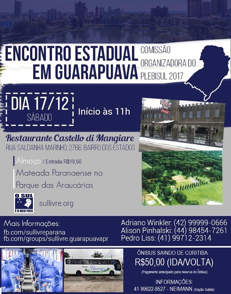 O evento acontece no próximo dia 17 de dezembro com início as 11 horas, tendo como local o restaurante Castello di Mangiare (Rua Saldanha Marinho, n° 2766, Bairro dos Estados, 85035-160) e faz parte das comemorações dos 163 anos de emancipação política da cidade de Guarapuava/PR. Veja abaixo a programação e confirme sua presença, no link ao final.