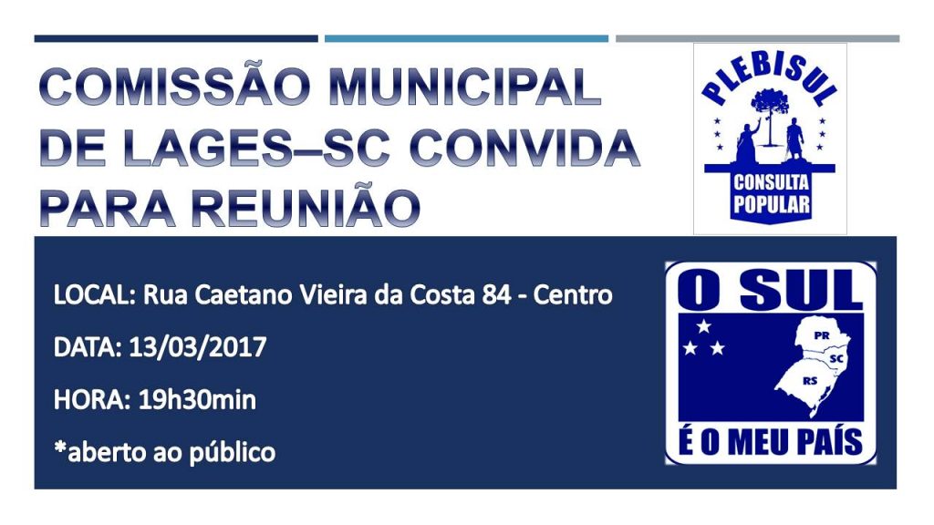 Na segunda-feira, 13 de março, será realizada reunião do movimento O Sul é o Meu País em Lages. Ela acontecerá a partir das 19h30 na Rua Caetano Vieira da Costa. 84.