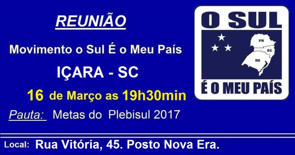 O movimento o Sul é o Meu País convida para reunião que será realizada em Içara/SC no dia 16 de março de 2017, a partir das 19h30, no Posto Nova Era, localizado na Rua Vitória, 45.