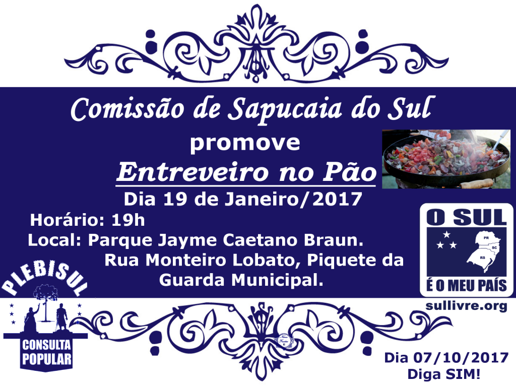 No dia 19/01 a comissão municipal de Sapucaia do Sul/RS realizará um Entreveiro no Pão. Ele acontecerá a partir das 19h00, no Parque Jayme Caetano Braun/Piquete da Guarda Municipal, localizado na Rua Monteiro Lobato, 244. O valor do entreveiro será de R$ 2,00.