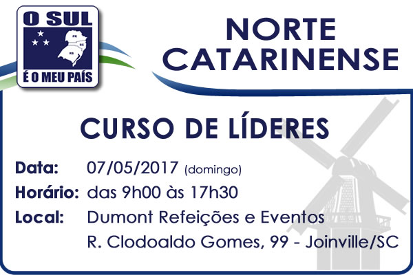 No dia de 07 maio o movimento O Sul é o Meu País realizará um curso de líderes para os simpatizantes do norte catarinense. Ele será realizado das 9h00 às 17h30, em Joinville/SC, no Dumont Refeições e Eventos, localizado na R. Clodoaldo Gomes, 99 – Zona Industrial Norte, Joinville – SC.