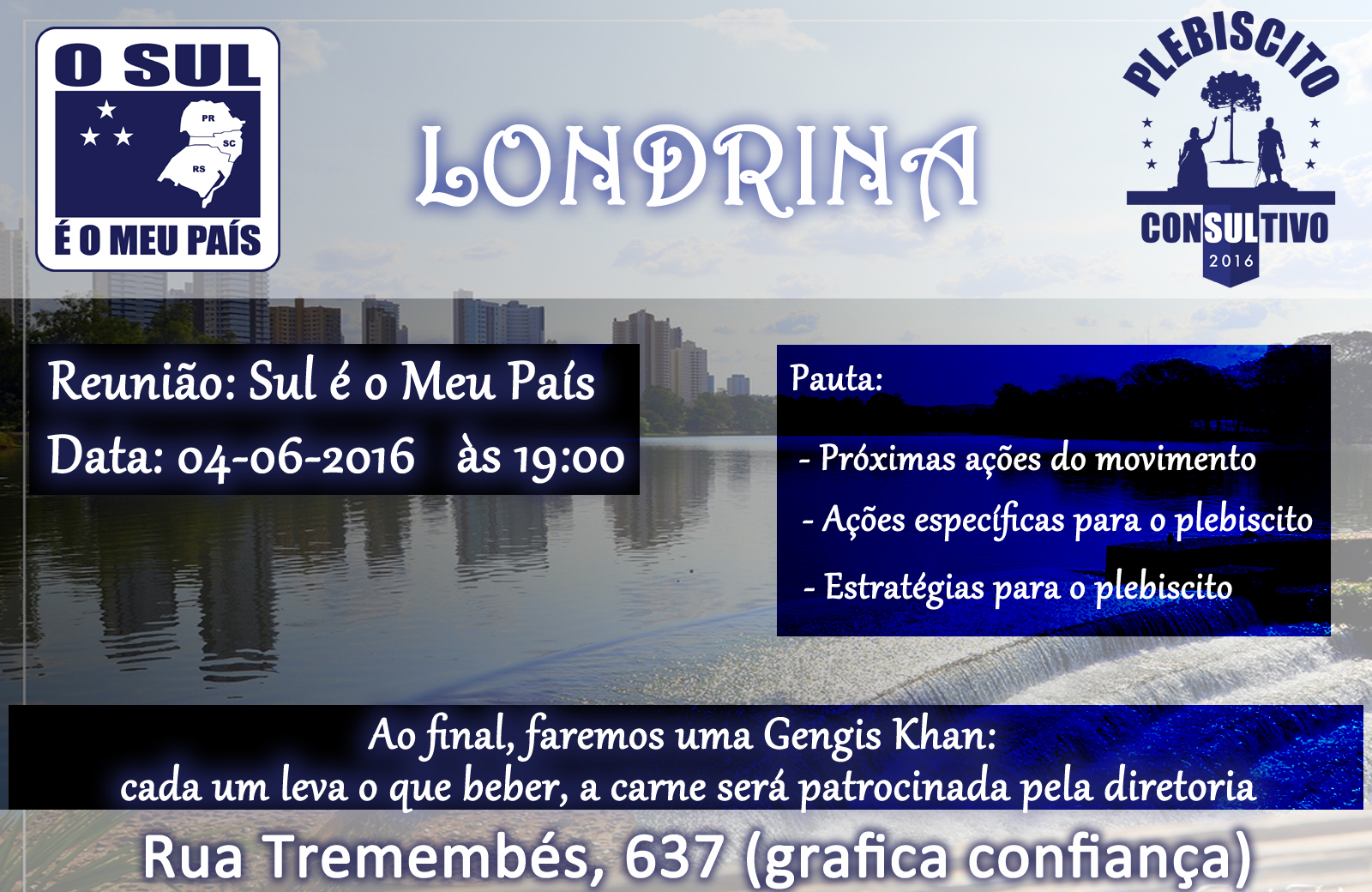 Neste sábado (4 de junho), a partir das 19h será realizada reunião do movimento O SUL É O MEU PAÍS em Londrina/PR. Ela será realizada na Gráfica Confiança, localizada na Rua Tremembés, 637(quase…