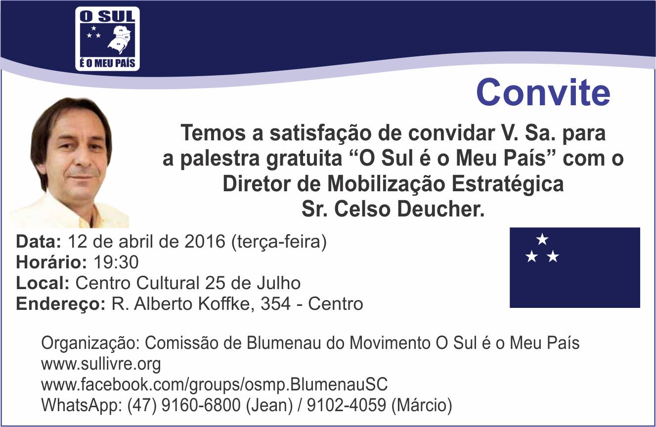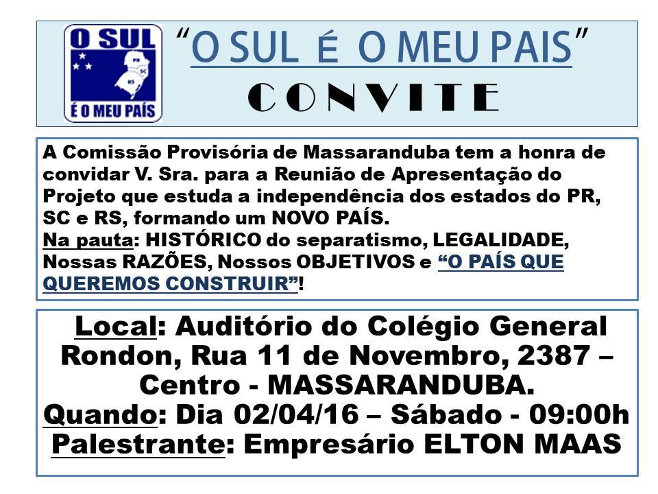 A comissão provisória de Massaranduba/SC convida para palestra sobre o movimento O SUL É O MEU PAÍS que será realizada às 9h00 do dia 02/04 (sábado) no auditório do Colégio General Rondon. A…