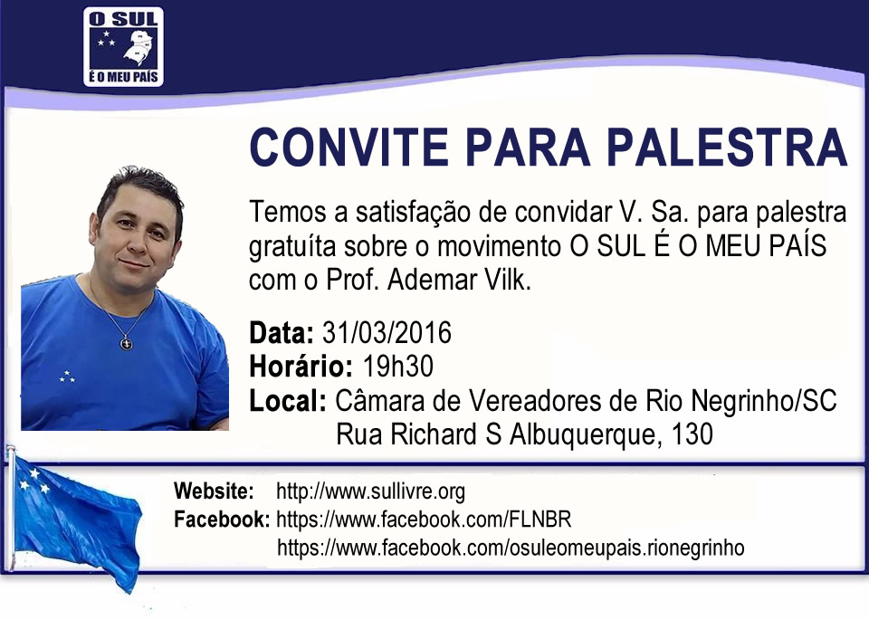 No próximo dia 31/03 (quinta-feira) a cidade de Rio Negrinho receberá às 19h30, em sua Câmara de Vereadores, uma palestra sobre o movimento O SUL É O MEU PAÍS. A palestra será realizada pelo Prof.…