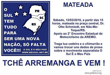O movimento O Sul é o meu pais, tem o prazer de convidar Vossa senhoria e família para a primeira reunião do Sul Livre, no município de Cambará do Sul. Esta reunião acontecerá no dia 18/03/2016, às…