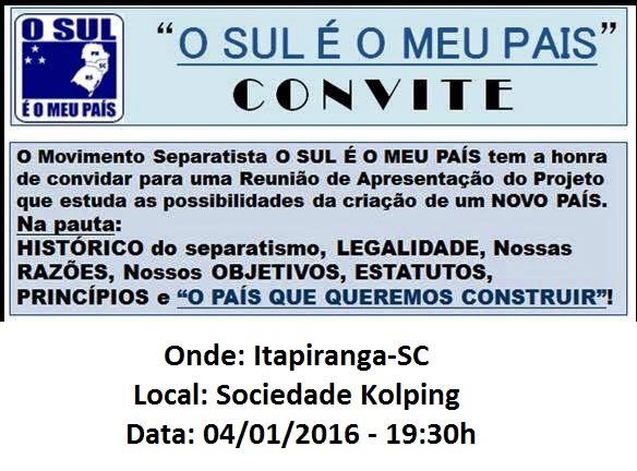 A comissão municipal de Itapiranga/SC convida para reunião e palestra de apresentação do movimento O SUL É O MEU PAÍS que será realizada dia 04/01/2016, às 19h30, na Sociedade Kolping. Na palestra…