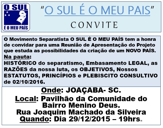 Os compatriotas do Movimento O Sul é o Meu País de Joaçaba e região convidam toda a comunidade do município e da região para prestigiarem a uma palestra explicativa sobre os objetivos e metas da…