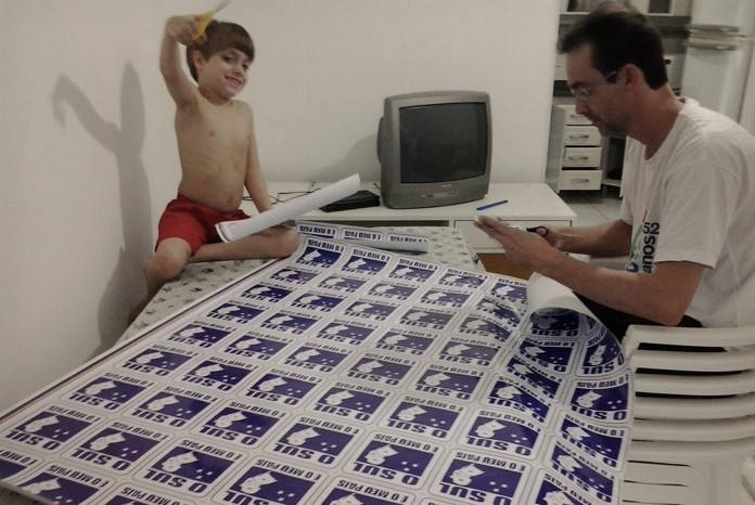 Em Itapema, o líder do Movimento O Sul é O Meu País contou com a ajuda do filho na hora de recortar os adesivos. A Comissão Municipal de Itapema adquiriu 2000 adesivos, que foram patrocinados por um…
