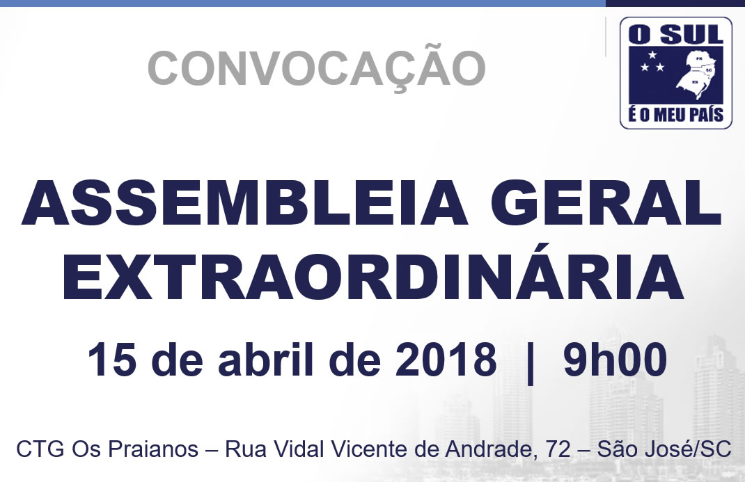 O presidente do Movimento O Sul é o Meu País, no uso das atribuições que lhe confere o Artigo 13 do Estatuto, em consonância com Artigo 16, convoca os associados para Assembleia Geral Extraordinária,…
