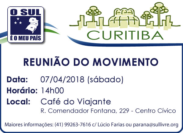 No sábado, dia 07 de abril, será realizada reunião do Movimento O Sul é o Meu País em Curitiba/PR. Ela será realizada a partir das 14h00 no Café do Viajante, localizado na Rua Comendador Fontana,…
