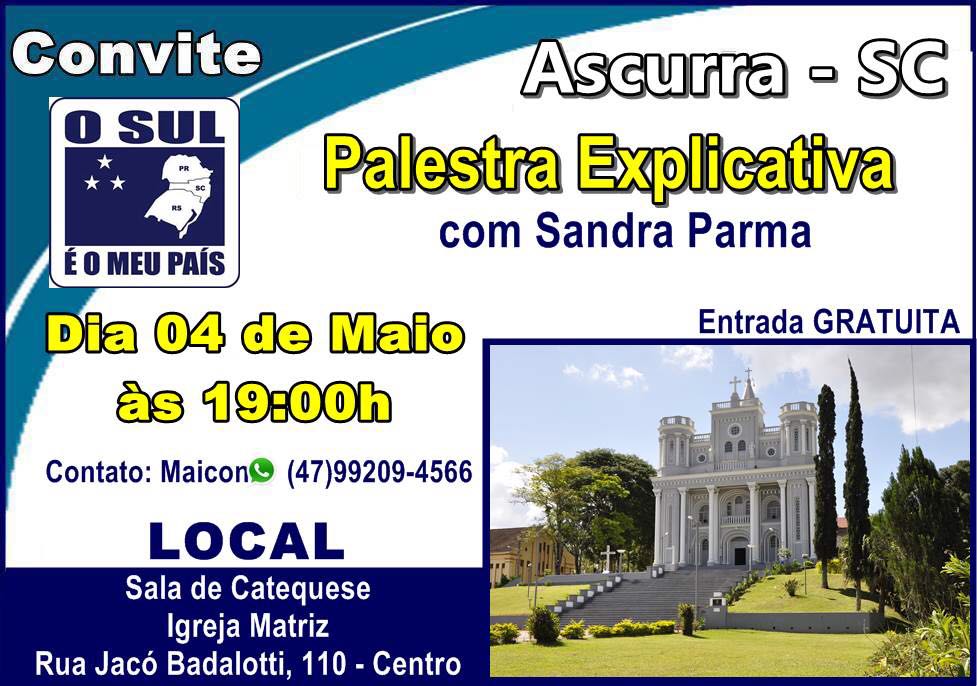 O movimento "O SUL É O MEU PAÍS" convida a população de Ascurra e região, para a palestra explicativa com a Superintendente do estado de Santa Catarina, Sandra Parma. Ela será realizada no dia 04 de…