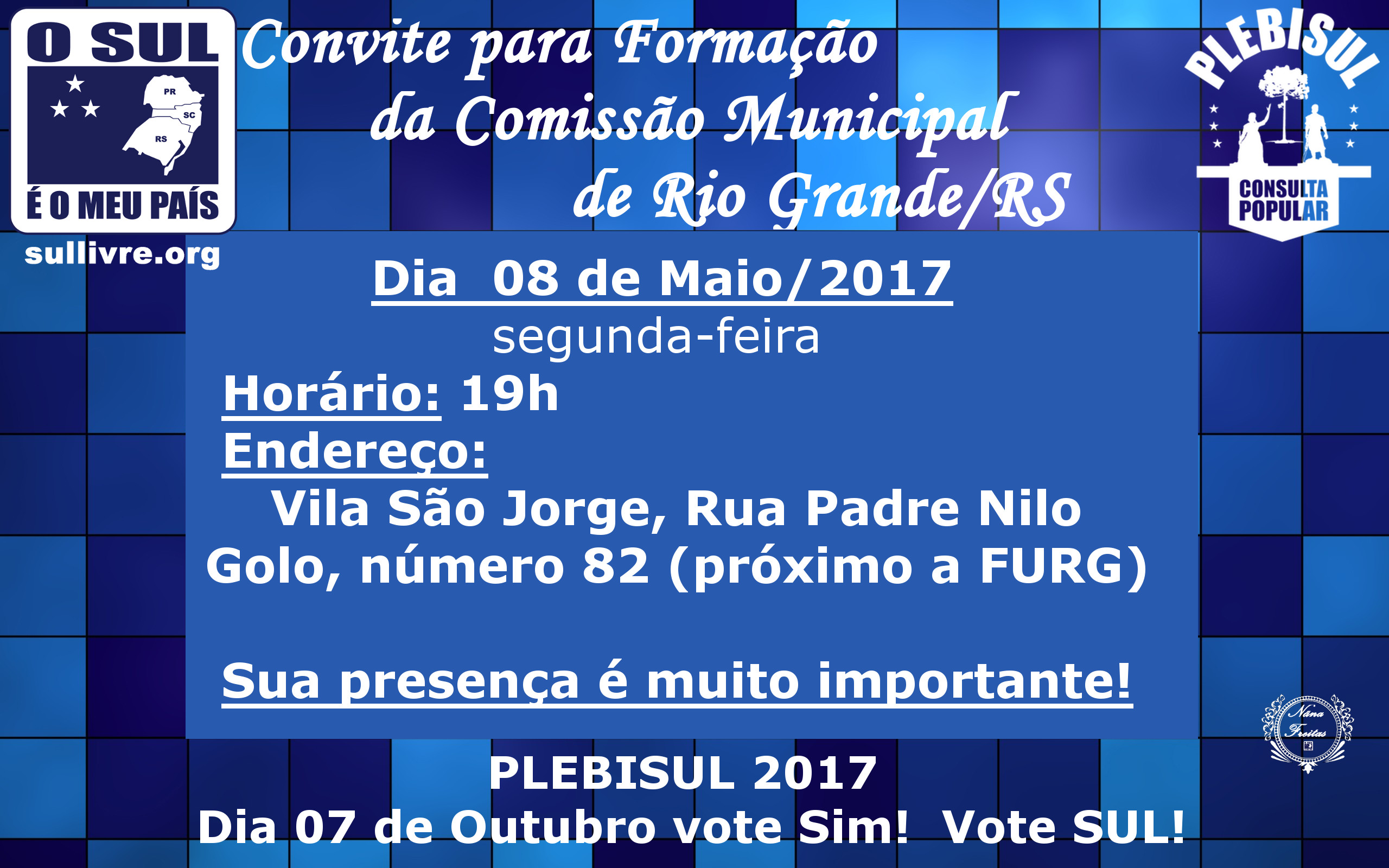 O movimento O Sul é o Meu País convida para reunião aberta que será realizada às 19h00 do dia 08 de maio para formação da comissão municipal de Rio Grande/RS. O evento acontecerá na Rua Padre Nilo…